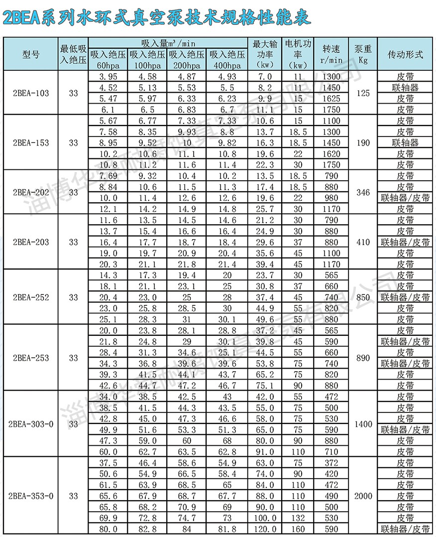 1、上列性能数据基于进气温度20%,进水温度15℃,排气压力1013hpa,吸入介质为饱和空气的条件。