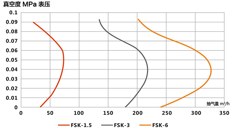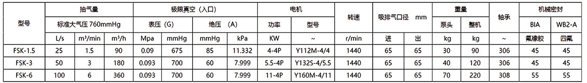FSK系列耐腐蚀真空泵适应于90~360m³/h的低抽气量区间,极限真空度较低,可增加电机功率作为压缩机使用。